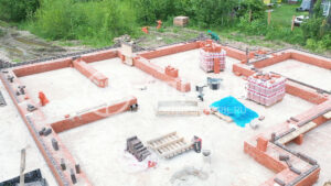 При строительстве этого объекта использовался газобетонный блок марки D 500. Облицовочный одинарный клинкерный кирпич. Кровельное покрытие – металлочерепица с матовым напылением. Железобетонные многопустотные плиты перекрытия. Срок строительства – 3 месяца