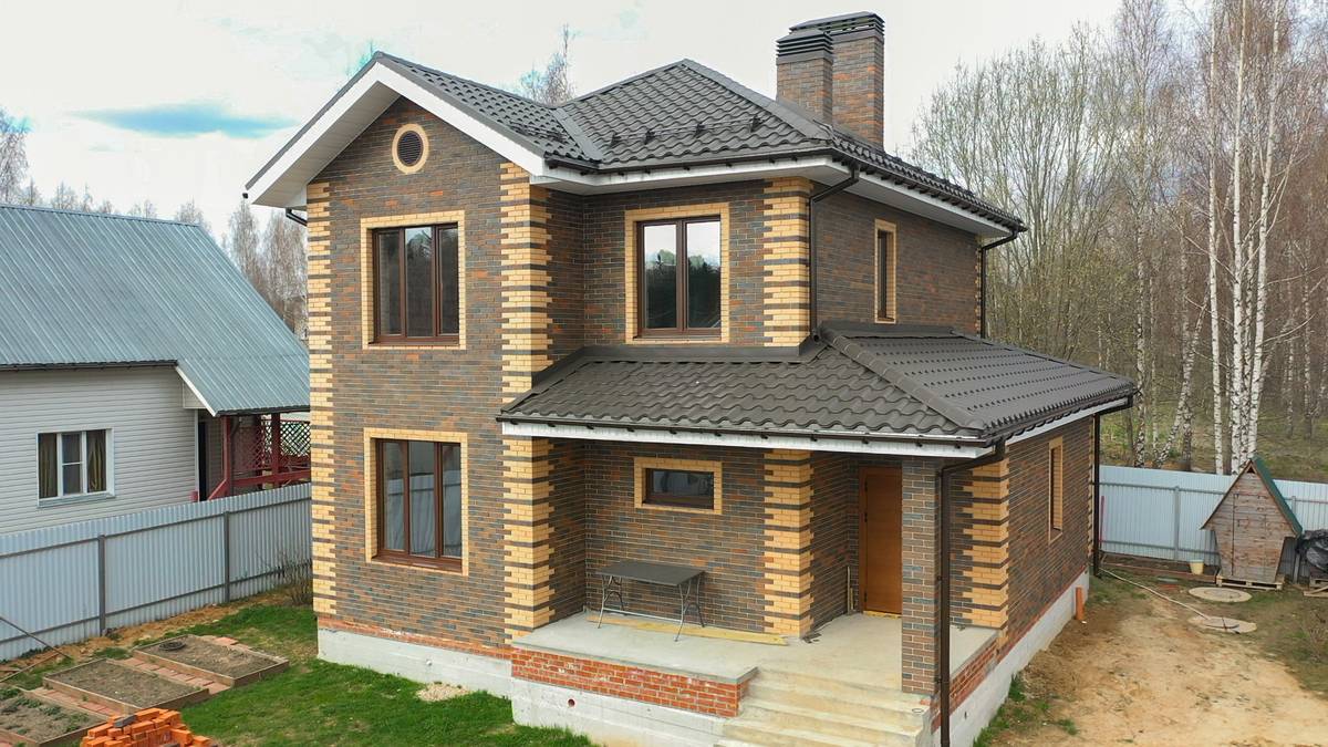 При строительстве этого дома использовался газобетонный блок марки D 500. Облицовочный одинарный кирпич «Баварская кладка». Кровельное покрытие – металлочерепица. В доме предусмотрен гараж и игровая комната. Срок строительства – 4 месяца
