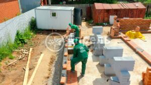 При строительстве этого дома использовался: газобетонный блок марки D 500. Облицовочный кирпич полуторный «ПКК на Закаменной» марки М 150. Кровельное покрытие металлочерепица «Монтеррей». В доме предусмотрен гараж на один автомобиль с обустроенной котельной. Срок строительства 3 месяца
