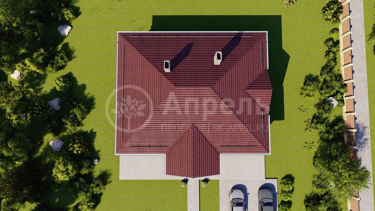 Стропильный каркас (доска сечением 200х50 мм), обрешетка (доска сечением 150х25 мм). Контробрешетка из бруска (50х50 мм). Пропитка пиломатериала огнебиозащитой. Ветро-влагозащитная мембрана Изоспан. Кровля — металлочерепица Grand Line (толщина 0,5 мм). Обшивка свесов кровли виниловыми софитами, монтаж ветровой планки.