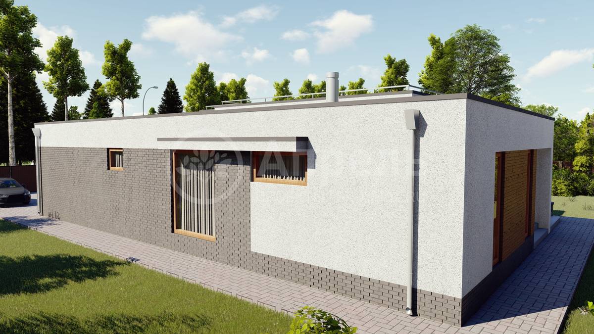 Стропильный каркас (доска сечением 200х50 мм), обрешетка (доска сечением 150х25 мм). Контробрешетка из бруска (50х50 мм). Пропитка пиломатериала огнебиозащитой. Ветро-влагозащитная мембрана Изоспан. Кровля — металлочерепица Grand Line (толщина 0,5 мм). Обшивка свесов кровли виниловыми софитами, монтаж ветровой планки.