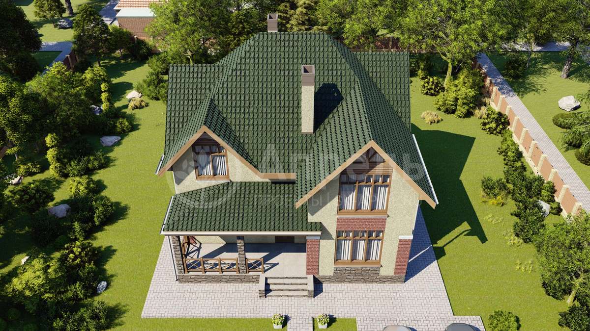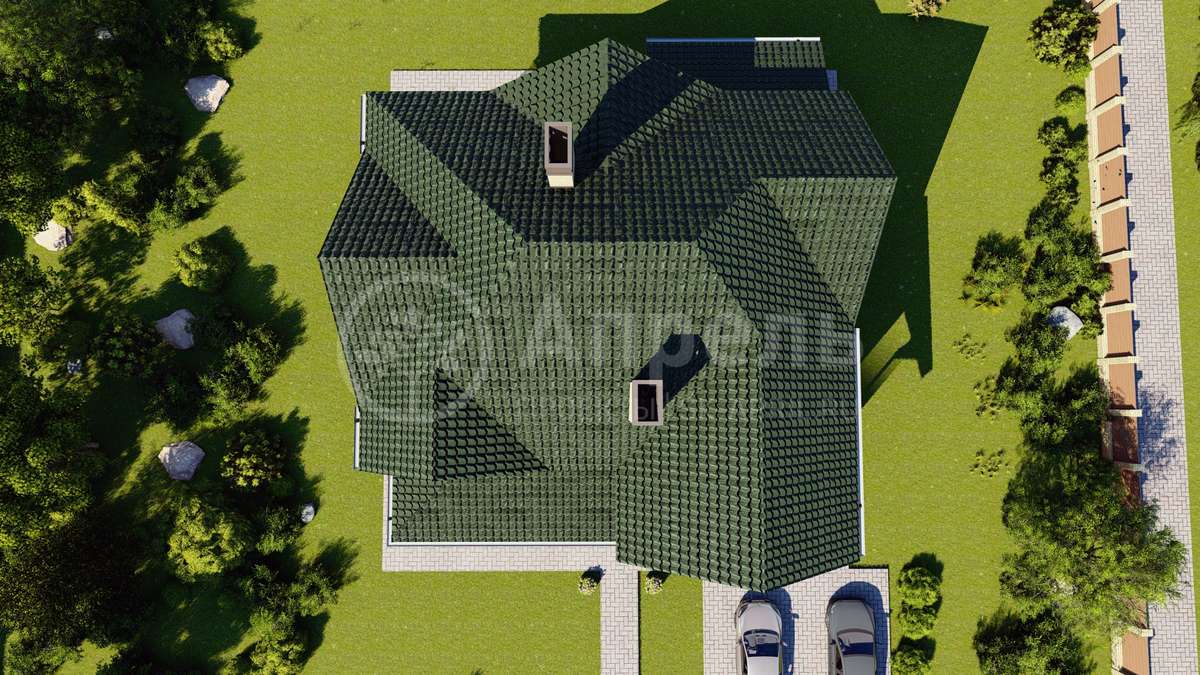 Стропильный каркас (доска сечением 200х50 мм), обрешетка (доска сечением 150х25 мм). Контробрешетка из бруска (50х50 мм). Пропитка пиломатериала огнебиозащитой. Ветро-влагозащитная мембрана Изоспан. Кровля — металлочерепица Grand Line (толщина 0,5 мм). Обшивка свесов кровли виниловыми софитами, монтаж ветровой планки.