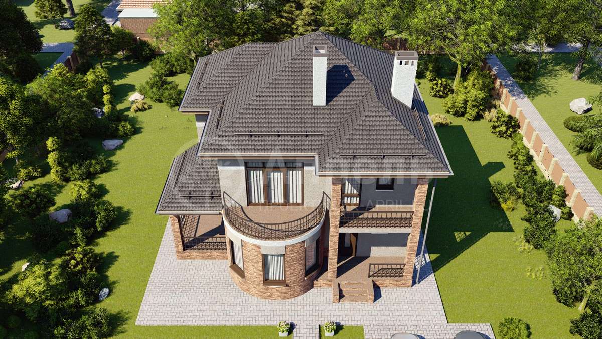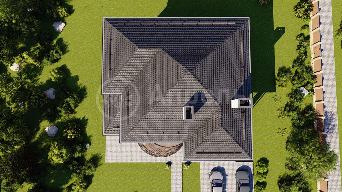 Стропильный каркас (доска сечением 200х50 мм), обрешетка (доска сечением 150х25 мм). Контробрешетка из бруска (50х50 мм). Пропитка пиломатериала огнебиозащитой. Ветро-влагозащитная мембрана Изоспан. Кровля — металлочерепица Grand Line (толщина 0,5 мм). Обшивка свесов кровли виниловыми софитами, монтаж ветровой планки.