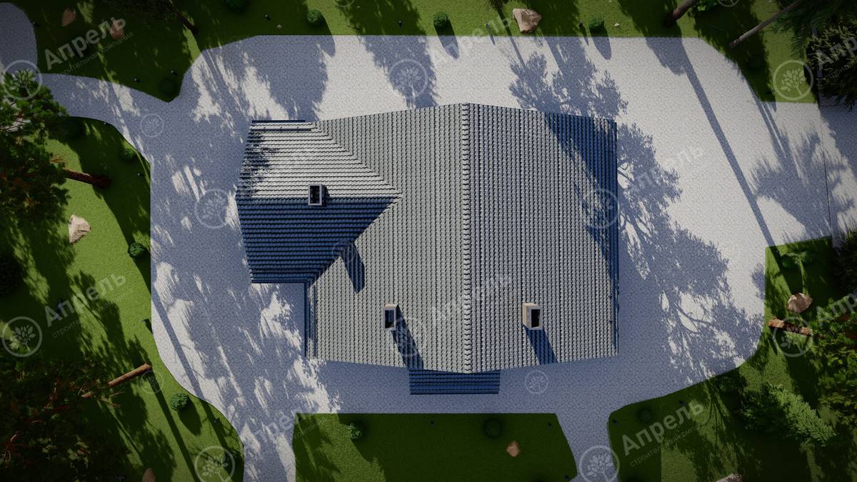 Стропильный каркас (доска сечением 200х50 мм), обрешетка (доска сечением 150х25 мм). Контробрешетка из бруска (50х50 мм). Пропитка пиломатериала огнебиозащитой. Ветро-влагозащитная мембрана Изоспан. Кровля — металлочерепица Grand Line (толщина 0,5 мм). Обшивка свесов кровли виниловыми софитами, монтаж ветровой планки.
