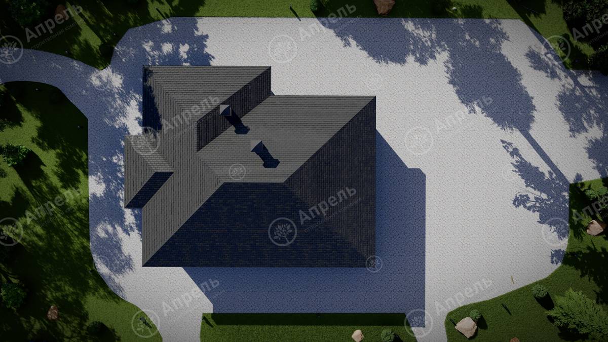 Стропильный каркас (доска сечением 200х50 мм), обрешетка (доска сечением 150х25 мм). Контробрешетка из бруска (50х50 мм). Пропитка пиломатериала огнебиозащитой. Ветро-влагозащитная мембрана Изоспан. Кровля — металлочерепица Grand Line (толщина 0,5 мм). Обшивка свесов кровли виниловыми софитами, монтаж ветровой планки.