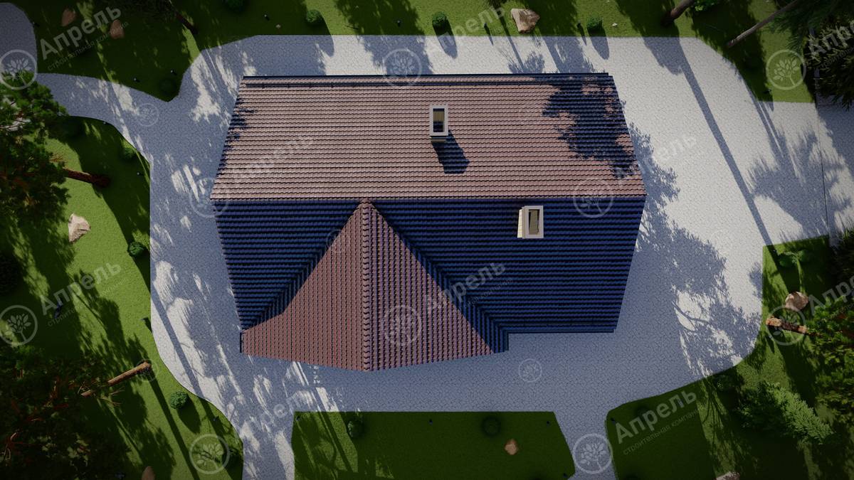 Стропильный каркас (доска сечением 200х50 мм), обрешетка (доска сечением 150х25 мм). Контробрешетка из бруска (50х50 мм). Пропитка пиломатериала огнебиозащитой. Ветро-влагозащитная мембрана Изоспан. Кровля — металлочерепица Grand Line (толщина 0,5 мм). Обшивка свесов кровли виниловыми софитами, монтаж ветровой планки.
