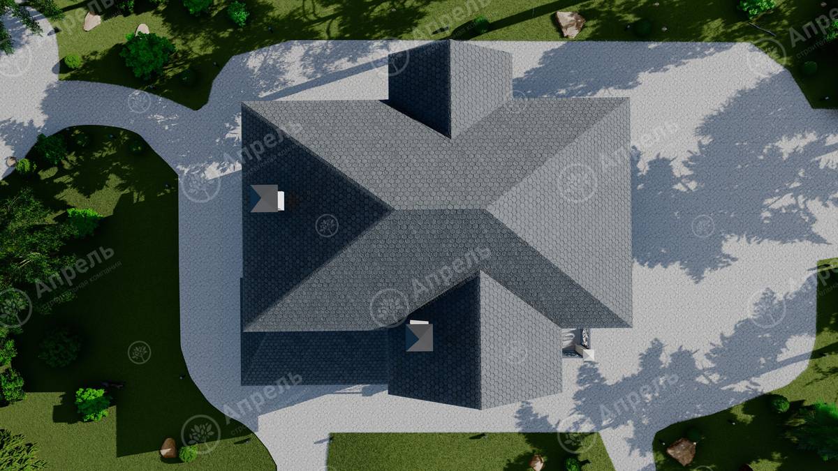 Стропильный каркас (доска сечением 200х50 мм), обрешетка (доска сечением 150х25 мм). Контробрешетка из бруска (50х50 мм). Пропитка пиломатериала огнебиозащитой. Ветро-влагозащитная мембрана Изоспан. Кровля — металлочерепица Grand Line (толщина 0,5 мм). Обшивка свесов кровли виниловыми софитами, монтаж ветровой планки.