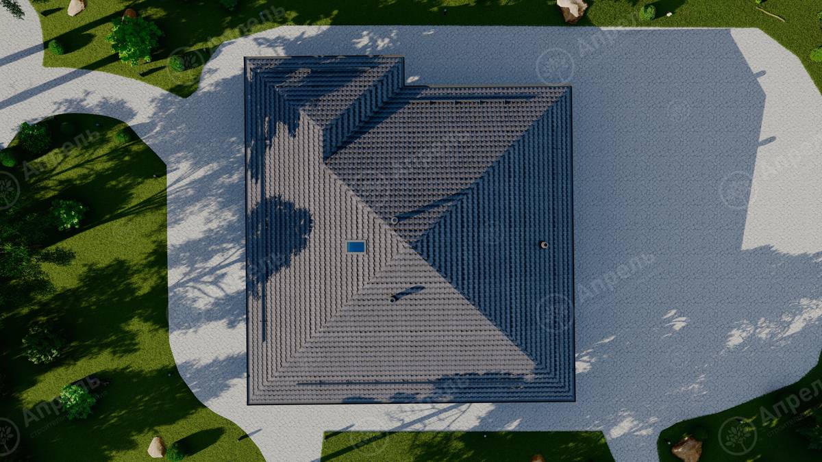 Стропильный каркас (доска сечением 200х50 мм), обрешетка (доска сечением 150х25 мм). Контробрешетка из бруска (50х50 мм). Пропитка пиломатериала огнебиозащитой. Ветро-влагозащитная мембрана Изоспан. Кровля — металлочерепица Grand Line (толщина 0,5 мм). Обшивка свесов кровли виниловыми софитами, монтаж ветровой планки.
