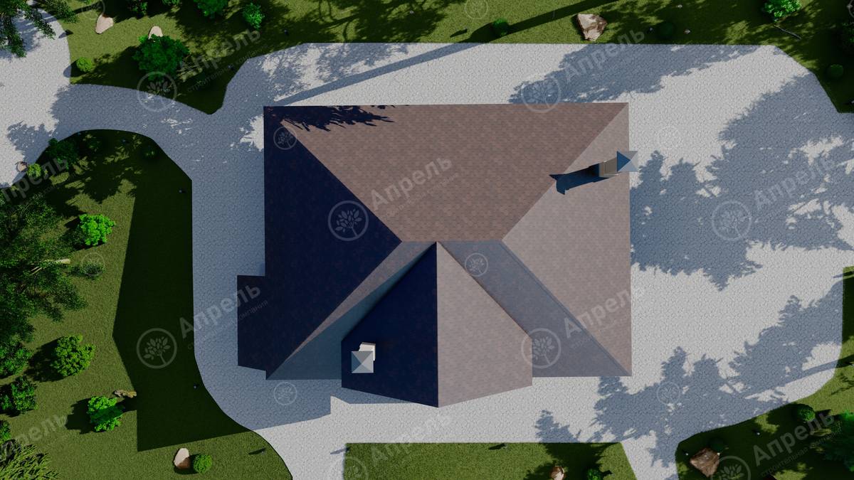 Стропильный каркас (доска сечением 200х50 мм), обрешетка (доска сечением 150х25 мм). Контробрешетка из бруска (50х50 мм). Пропитка пиломатериала огнебиозащитой. Ветро-влагозащитная мембрана Изоспан. Кровля — металлочерепица Grand Line (толщина 0,5 мм). Обшивка свесов кровли виниловыми софитами, монтаж ветровой планки.