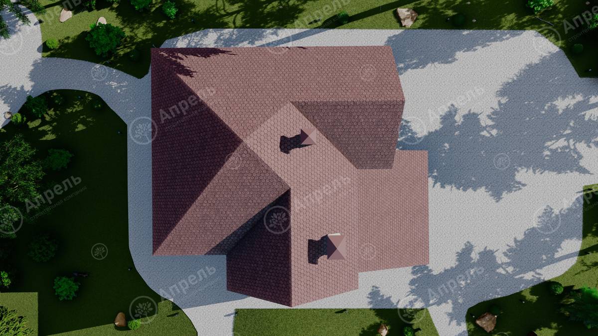 Стропильный каркас (доска сечением 200х50 мм), обрешетка (доска сечением 150х25 мм). Контробрешетка из бруска (50х50 мм). Пропитка пиломатериала огнебиозащитой. Ветро-влагозащитная мембрана Изоспан. Кровля — металлочерепица Grand Line (толщина 0,5 мм). Обшивка свесов кровли виниловыми софитами, монтаж ветровой планки.
