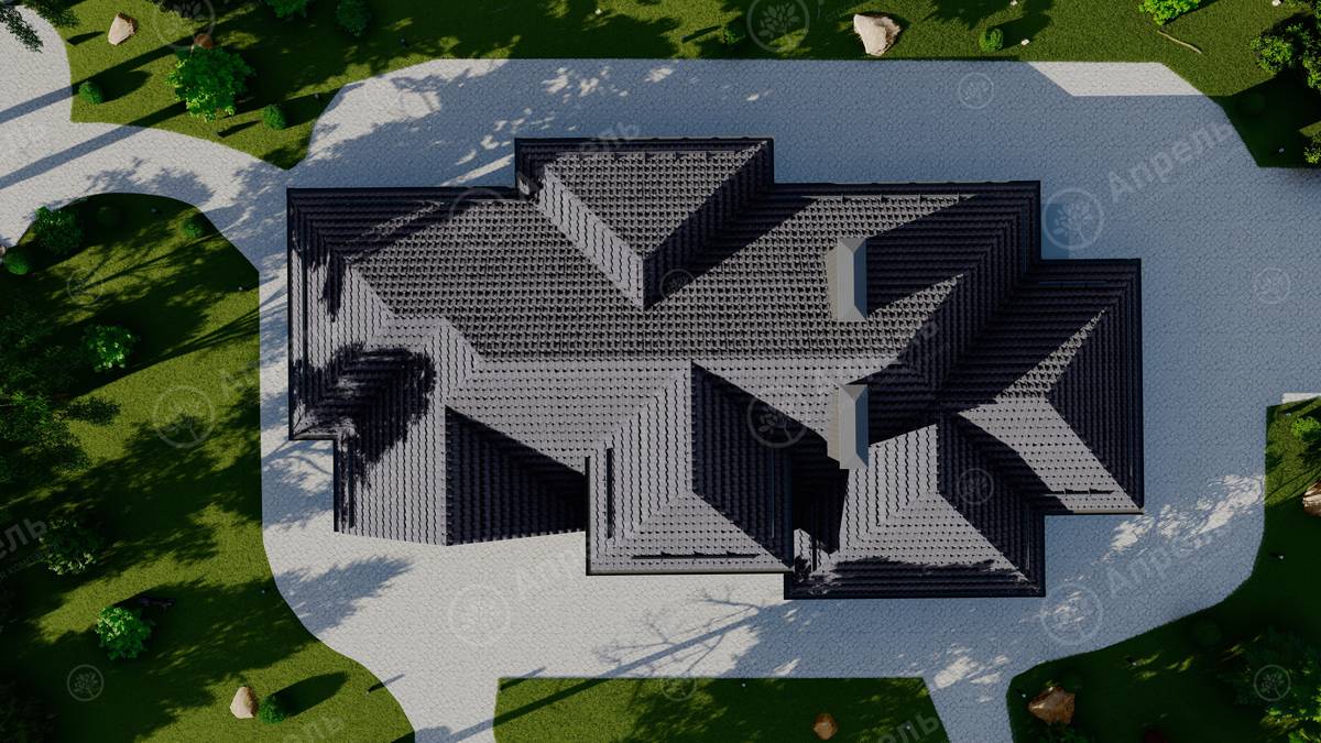 Стропильный каркас (доска сечением 200х50 мм), обрешетка (доска сечением 150х25 мм). Контробрешетка из бруска (50х50 мм). Пропитка пиломатериала огнебиозащитой. Ветро-влагозащитная мембрана Изоспан. Кровля — металлочерепица Grand Line (толщина 0,5 мм). Обшивка свесов кровли виниловыми софитами, монтаж ветровой планки.