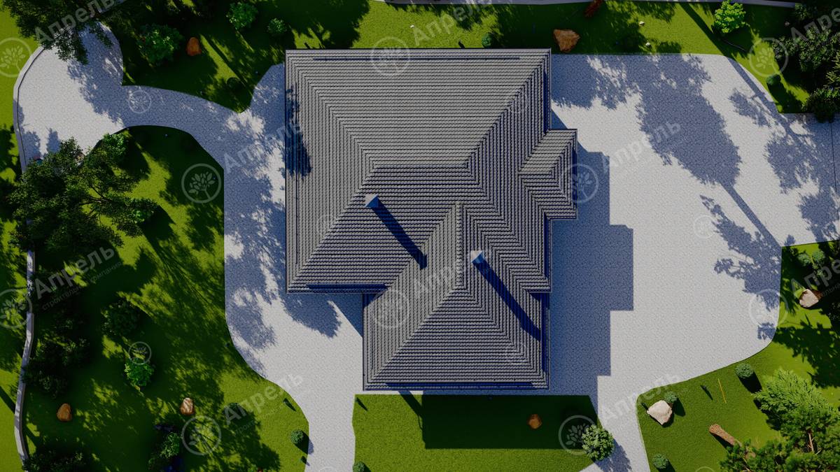 Стропильный каркас (доска сечением 200х50 мм), обрешетка (доска сечением 150х25 мм). Контробрешетка из бруска (50х50 мм). Пропитка пиломатериала огнебиозащитой. Ветро-влагозащитная мембрана Изоспан. Кровля — металлочерепица Grand Line (толщина 0,5 мм). Обшивка свесов кровли виниловыми софитами, монтаж ветровой планки.