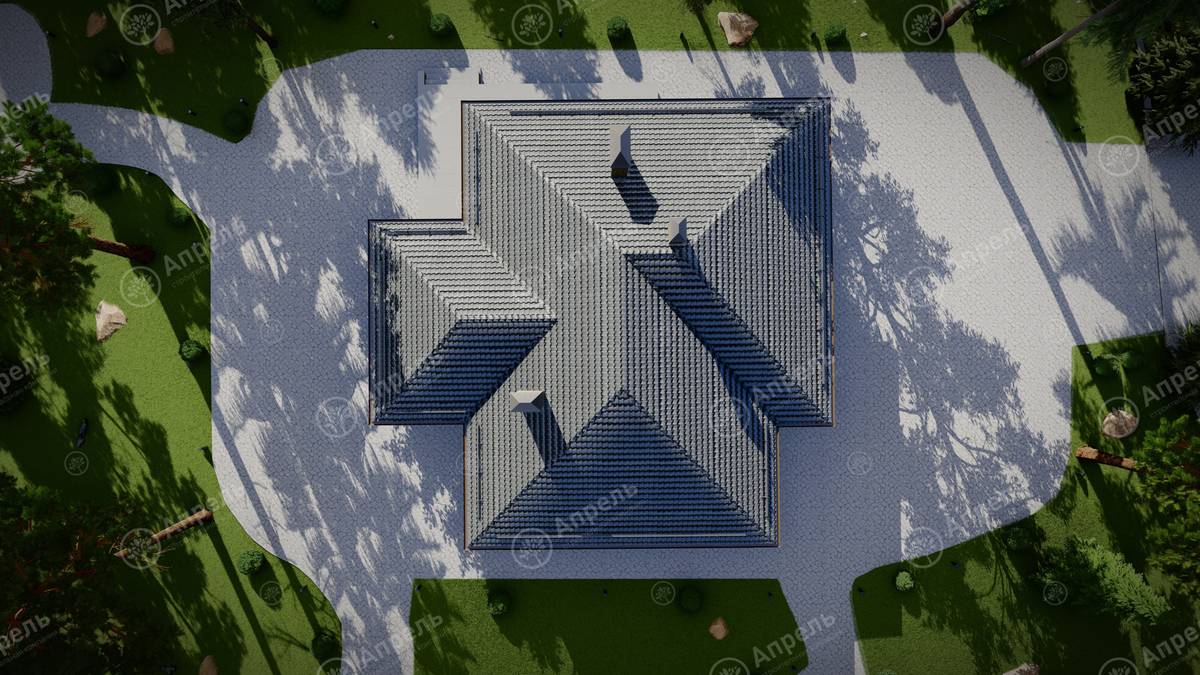 Стропильный каркас (доска сечением 200х50 мм), обрешетка (доска сечением 150х25 мм). Контробрешетка из бруска (50х50 мм). Пропитка пиломатериала огнебиозащитой. Ветро-влагозащитная мембрана Изоспан. Кровля — металлочерепица Grand Line (толщина 0,5 мм). Обшивка свесов кровли виниловыми софитами, монтаж ветровой планки.