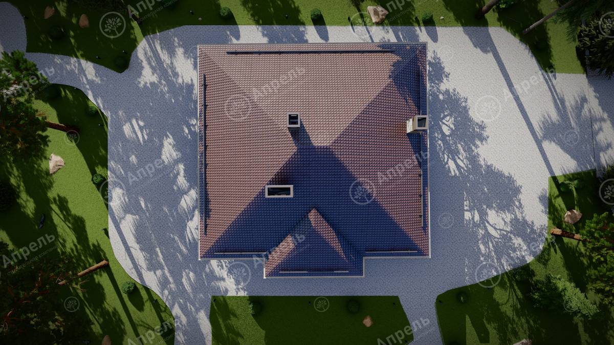Стропильный каркас (доска сечением 200х50 мм), обрешетка (доска сечением 150х25 мм). Контробрешетка из бруска (50х50 мм). Пропитка пиломатериала огнебиозащитой. Ветро-влагозащитная мембрана Изоспан. Кровля — металлочерепица Grand Line (толщина 0,5 мм). Обшивка свесов кровли виниловыми софитами, монтаж ветровой планки.