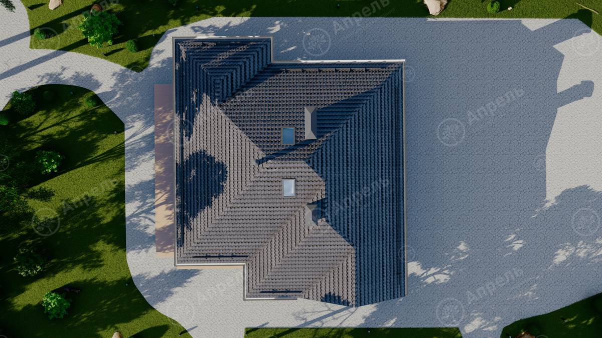 Стропильный каркас (доска сечением 200х50 мм), обрешетка (доска сечением 150х25 мм). Контробрешетка из бруска (50х50 мм). Пропитка пиломатериала огнебиозащитой. Ветро-влагозащитная мембрана Изоспан. Кровля — металлочерепица Grand Line (толщина 0,5 мм). Обшивка свесов кровли виниловыми софитами, монтаж ветровой планки.