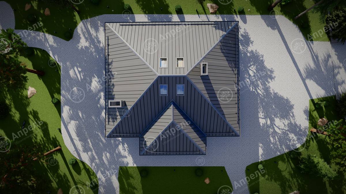 Стропильный каркас (доска сечением 200х50 мм), обрешетка (доска сечением 150х25 мм). Контробрешетка из бруска (50х50 мм). Пропитка пиломатериала огнебиозащитой. Ветро-влагозащитная мембрана Изоспан. Кровля — металлочерепица Grand Line (толщина 0,5 мм). Обшивка свесов кровли виниловыми софитами, монтаж ветровой планки.