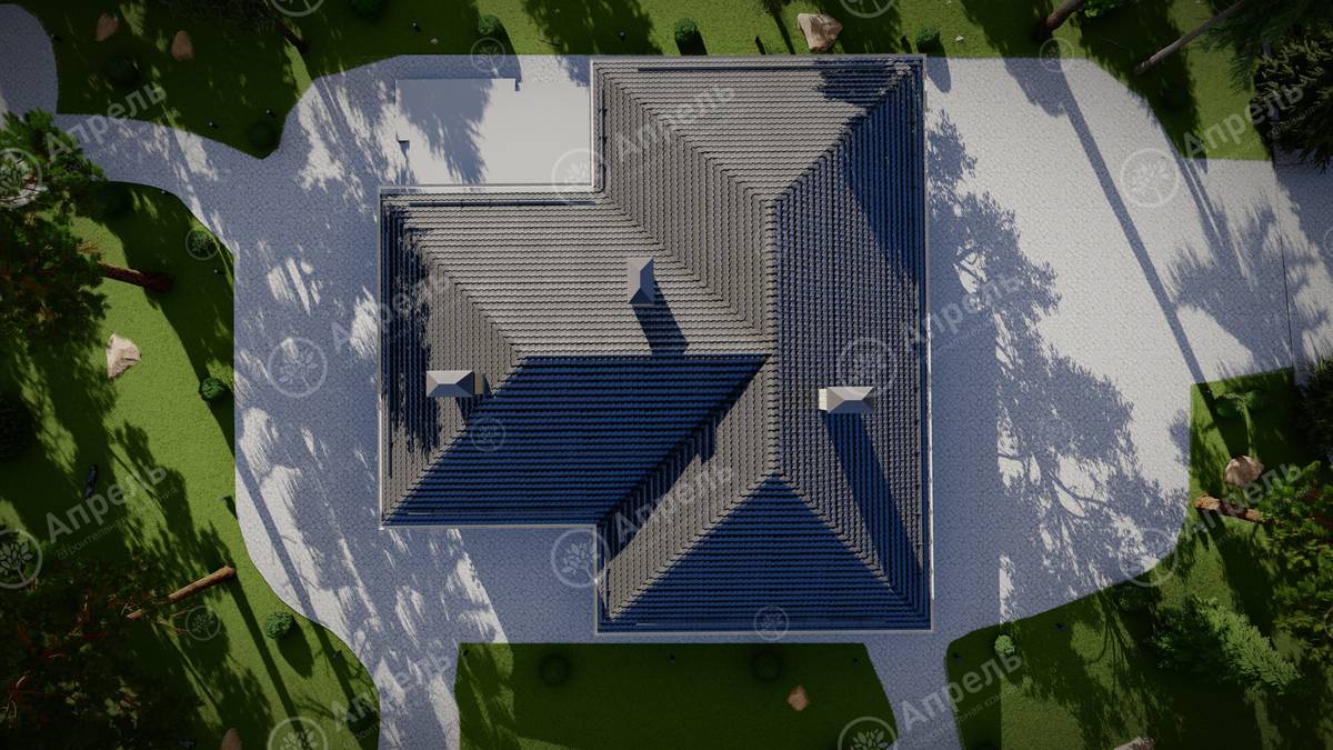 Стропильный каркас (доска сечением 200х50 мм), обрешетка (доска сечением 150х25 мм). Контробрешетка из бруска (50х50 мм). Пропитка пиломатериала огнебиозащитой. Ветро-влагозащитная мембрана Изоспан. Кровля — металлочерепица Grand Line (толщина 0,5 мм). Обшивка свесов кровли виниловыми софитами, монтаж ветровой планки.