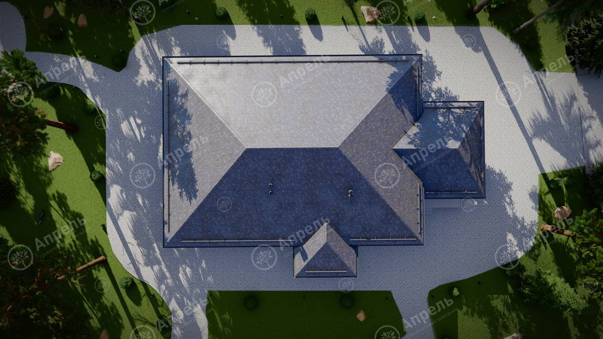 Стропильный каркас (доска сечением 200х50 мм), обрешетка (доска сечением 150х25 мм). Контробрешетка из бруска (50х50 мм). Пропитка пиломатериала огнебиозащитой. Ветро-влагозащитная мембрана Изоспан. Кровля — металлочерепица Grand Line (толщина 0,5 мм). Обшивка свесов кровли виниловыми софитами, монтаж ветровой планки.