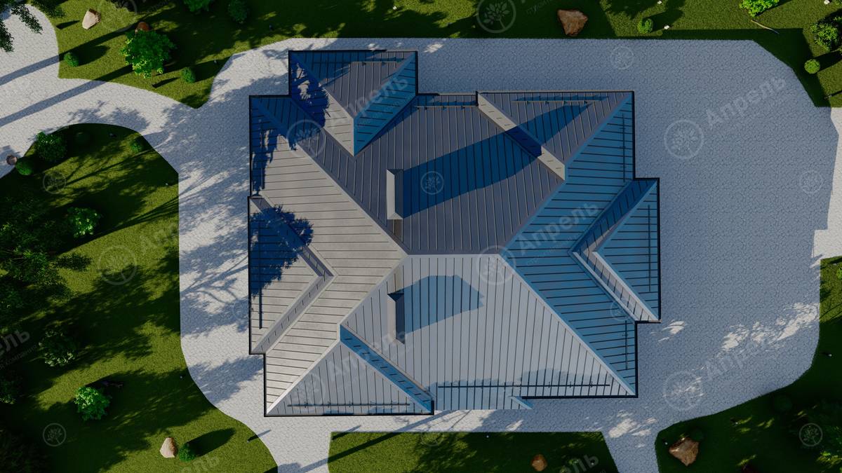 Стропильный каркас (доска сечением 200х50 мм), обрешетка (доска сечением 150х25 мм). Контробрешетка из бруска (50х50 мм). Пропитка пиломатериала огнебиозащитой. Ветро-влагозащитная мембрана Изоспан. Кровля — металлочерепица Grand Line (толщина 0,5 мм). Обшивка свесов кровли виниловыми софитами, монтаж ветровой планки.