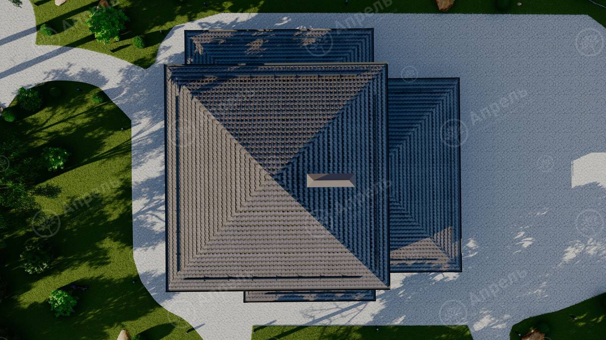 Стропильный каркас (доска сечением 200х50 мм), обрешетка (доска сечением 150х25 мм). Контробрешетка из бруска (50х50 мм). Пропитка пиломатериала огнебиозащитой. Ветро-влагозащитная мембрана Изоспан. Кровля — металлочерепица Grand Line (толщина 0,5 мм). Обшивка свесов кровли виниловыми софитами, монтаж ветровой планки.