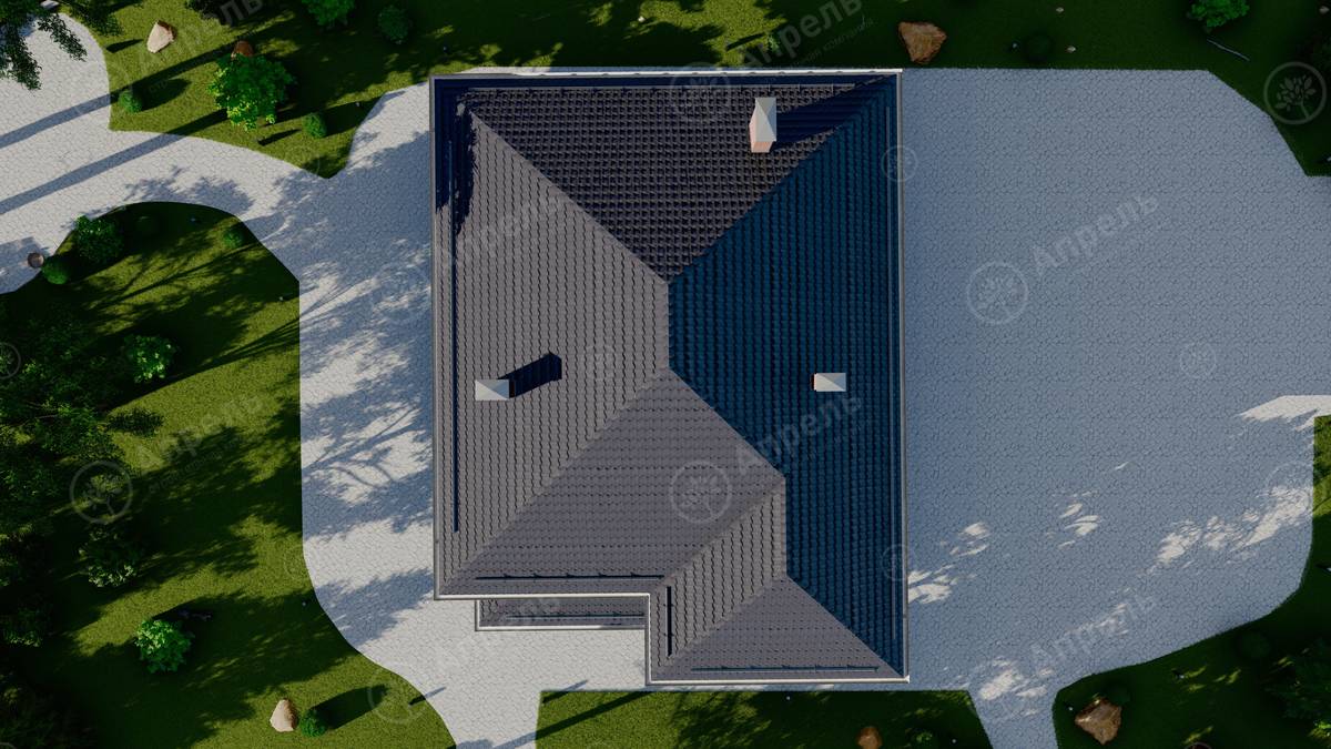 Стропильный каркас (доска сечением 200х50 мм), обрешетка (доска сечением 150х25 мм). Контробрешетка из бруска (50х50 мм). Пропитка пиломатериала огнебиозащитой. Ветро-влагозащитная мембрана Изоспан. Кровля — металлочерепица Grand Line (толщина 0,5 мм). Обшивка свесов кровли виниловыми софитами, монтаж ветровой планки.