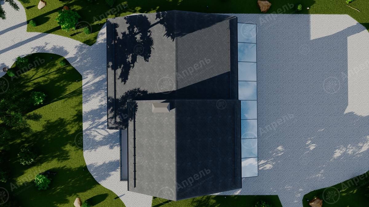 Стропильный каркас (доска сечением 200х50 мм), обрешетка (доска сечением 150х25 мм). Контробрешетка из бруска (50х50 мм). Пропитка пиломатериала огнебиозащитой. Ветро-влагозащитная мембрана Изоспан. Кровля — металлочерепица Grand Line (толщина 0,5 мм). Обшивка свесов кровли виниловыми софитами, монтаж ветровой планки.