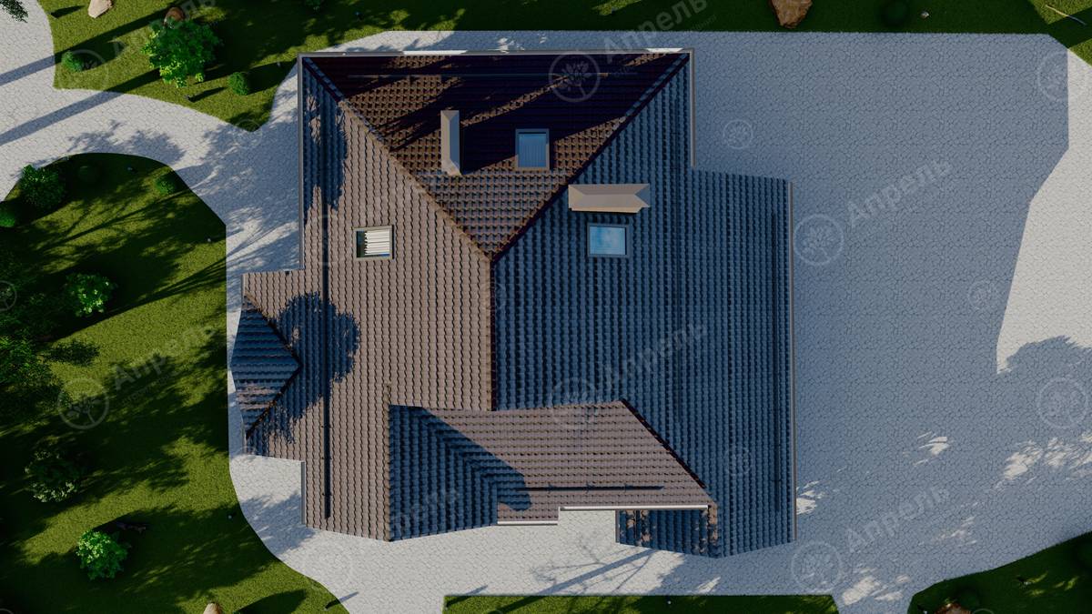 Стропильный каркас (доска сечением 200х50 мм), обрешетка (доска сечением 150х25 мм). Контробрешетка из бруска (50х50 мм). Пропитка пиломатериала огнебиозащитой. Ветро-влагозащитная мембрана Изоспан. Кровля — металлочерепица Grand Line (толщина 0,5 мм). Обшивка свесов кровли виниловыми софитами, монтаж ветровой планки.