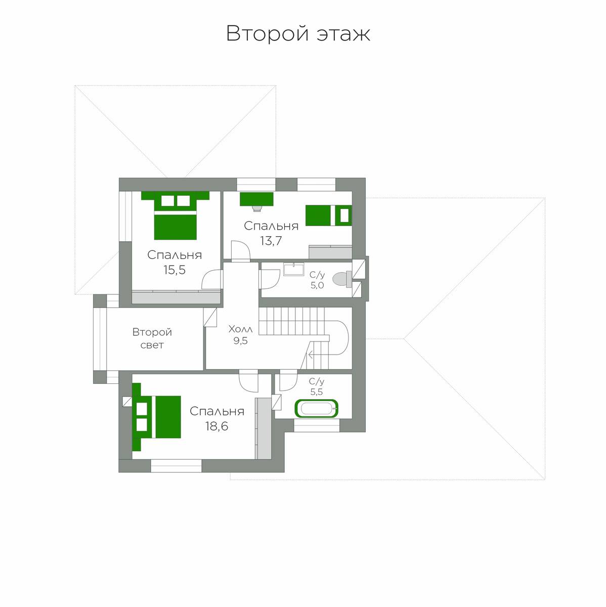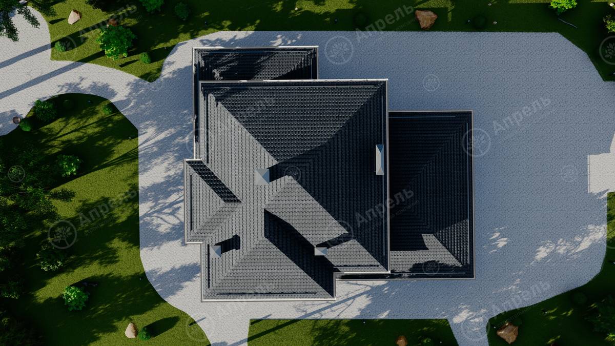 Стропильный каркас (доска сечением 200х50 мм), обрешетка (доска сечением 150х25 мм). Контробрешетка из бруска (50х50 мм). Пропитка пиломатериала огнебиозащитой. Ветро-влагозащитная мембрана Изоспан. Кровля — металлочерепица Grand Line (толщина 0,5 мм). Обшивка свесов кровли виниловыми софитами, монтаж ветровой планки.