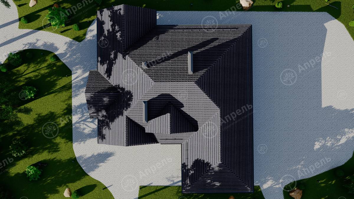 Стропильный каркас (доска сечением 200х50 мм), обрешетка (доска сечением 150х25 мм). Контробрешетка из бруска (50х50 мм). Пропитка пиломатериала огнебиозащитой. Ветро-влагозащитная мембрана Изоспан. Кровля — металлочерепица Grand Line (толщина 0,5 мм). Обшивка свесов кровли виниловыми софитами, монтаж ветровой планки.